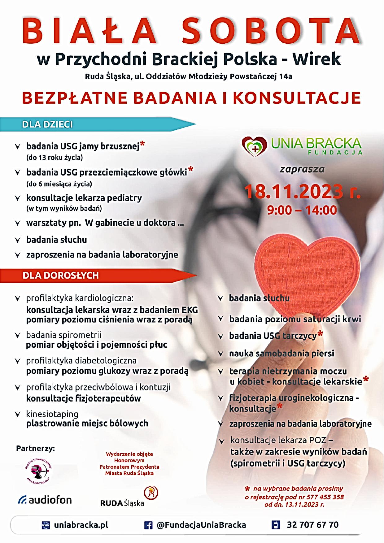 Nie zwalniamy tempa! 18 listopada 2023 roku zapraszamy do Przychodni Brackiej Polska-Wirek w Rudzie Śląskiej, w której odbędzie się pierwsza w nowoczesnym centrum medyczno-diagnostycznym „Biała Sobota” – akcja, podczas której każda odwiedzająca nas osoba, zarówno dorosły jak i dziecko, będzie miała możliwość wykonania szeregu badań profilaktycznych oraz uzyskania konsultacji lekarskich bezpłatnie!