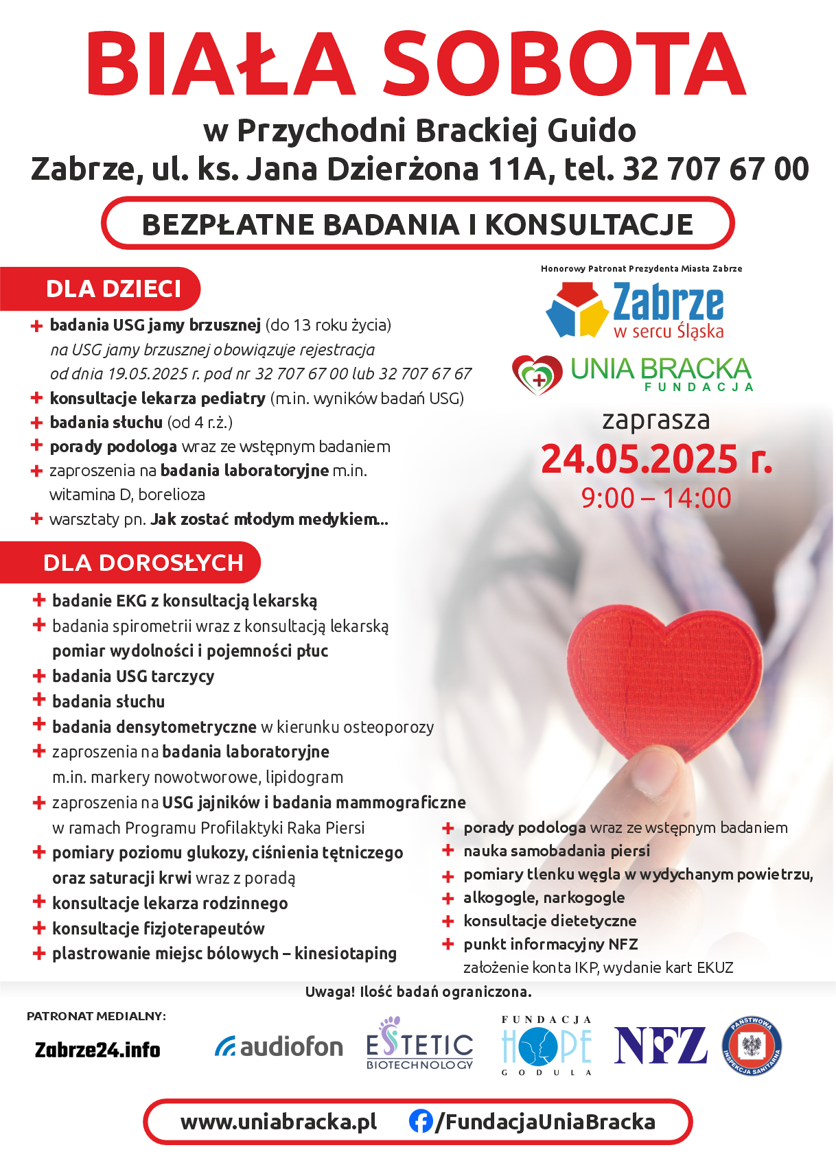 Już 24 maja 2025 r. w godzinach 9:00-14:00 zapraszamy na „Białą Sobotę” w Przychodni Brackiej Guido w Zabrzu. To wyjątkowa okazja, by bezpłatnie skorzystać z szeregu badań i konsultacji – zarówno przez dorosłych, jak i przez dzieci.
