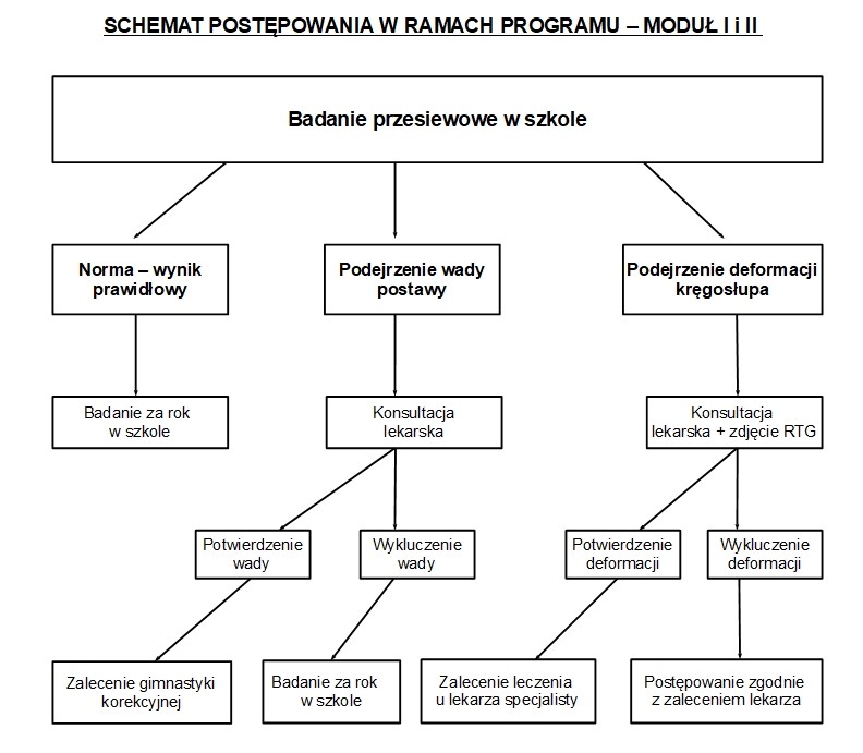 Z badań przesiewowych w ramach Modułu I tj. badań wykonanych przez pielęgniarkę szkolną lub fizjoterapeutę na terenie 10 szkół skorzystało aż 1943 dzieci. U ponad 70% z nich stwierdzone zostało podejrzenie występowania wady postawy lub deformacji kręgosłupa i zostały one skierowane na badanie lekarskie.