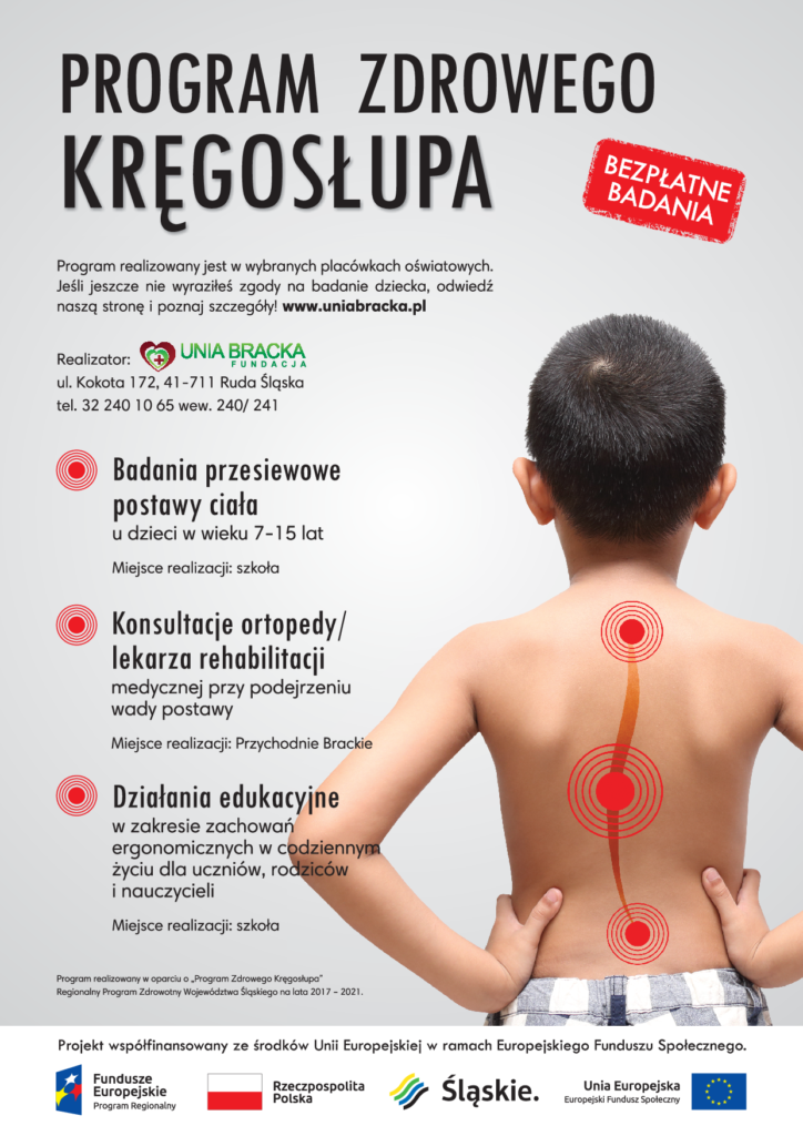 W lipcu 2018 r. Fundacja „Unia Bracka” rozpoczęła realizację projektu pn. Program Zdrowego Kręgosłupa – Ruda Śląska, Bytom współfinansowanego z Europejskiego Funduszu Społecznego.